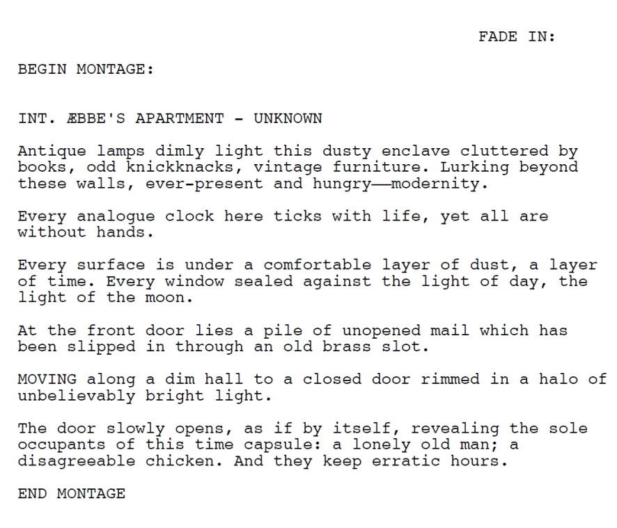 This is a fun script to read; with compelling characters and strong dialogue, there are many elements of this script that stand out as unique. From Æbbe’s best friend being his chicken, to the conversation he has with a potato, to his struggles with painting—there’s so much packed into this short film that is worth exploring.